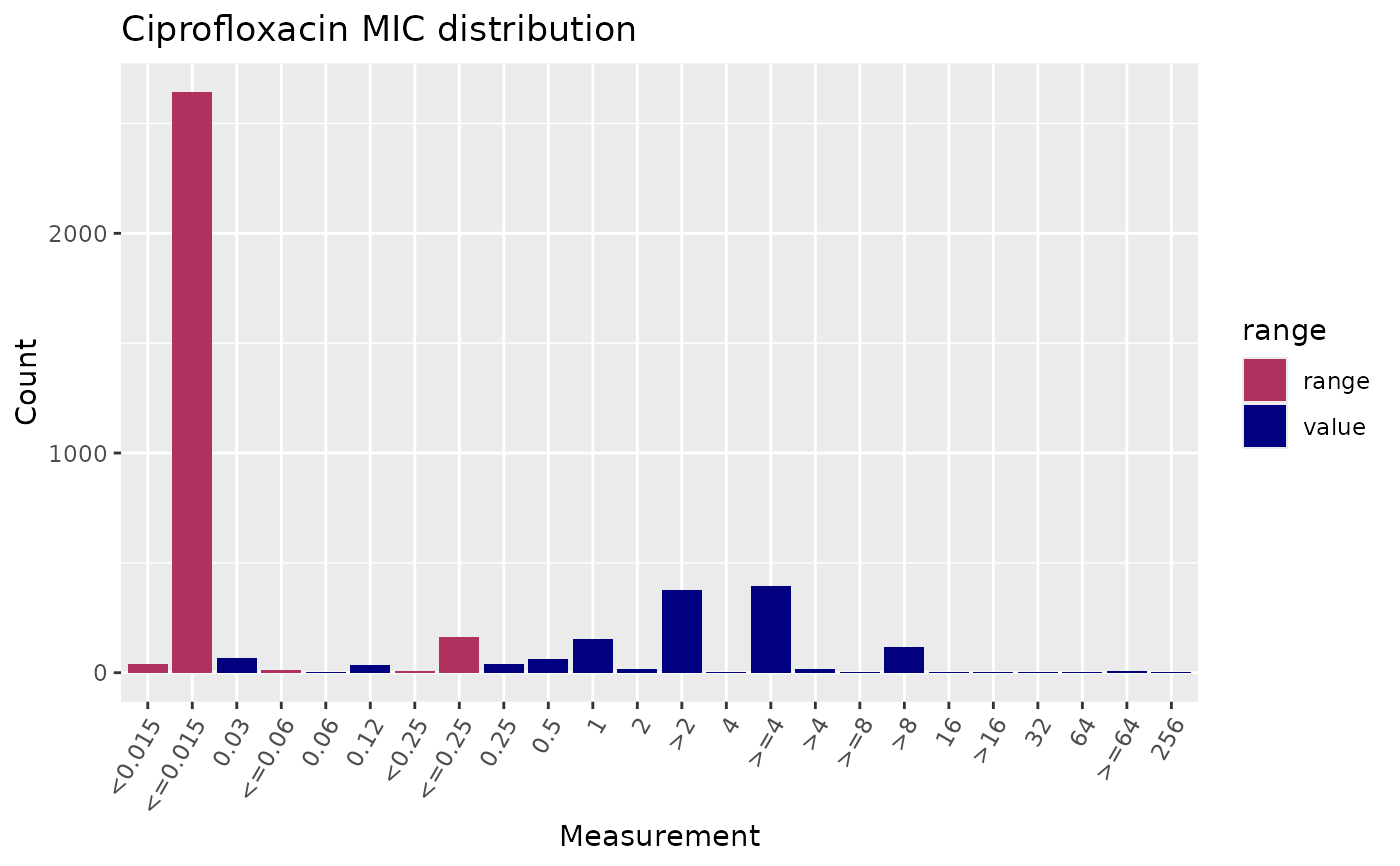 # plot MIC distribution, highlighting values expressed as ranges