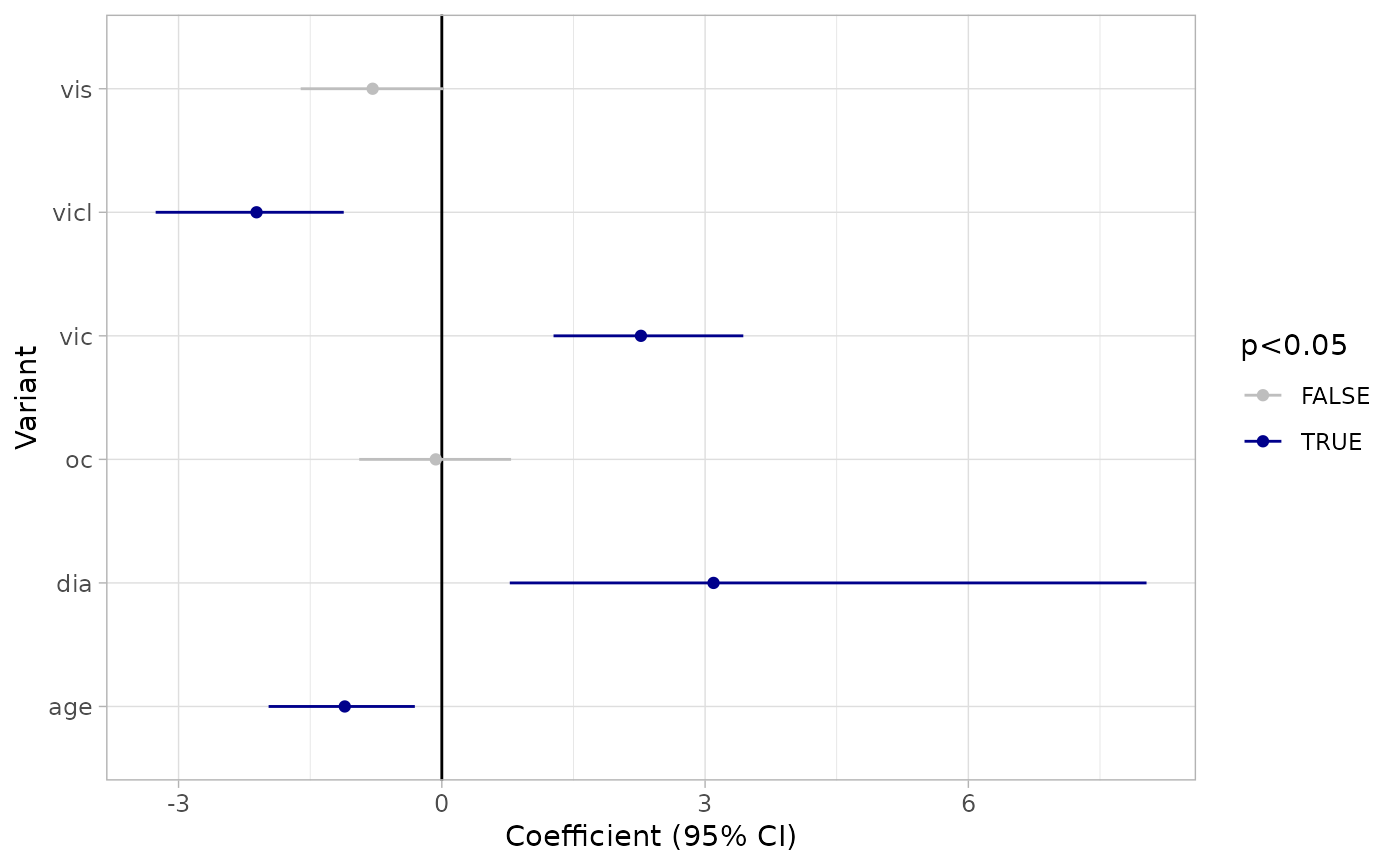 A tibble containing the estimates, confidence intervals, and p-values for each predictor in the model.